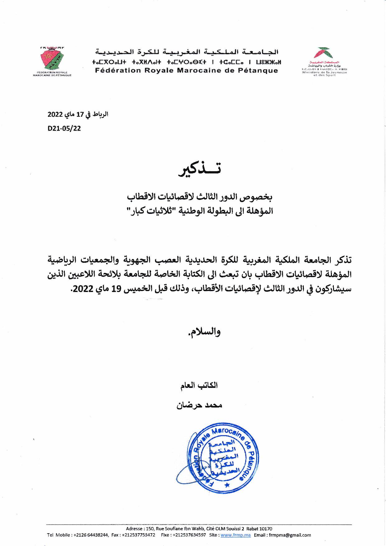 3e Etape des éliminatoires du Championnat du Maroc Senior par Zones le 21/05/2022
