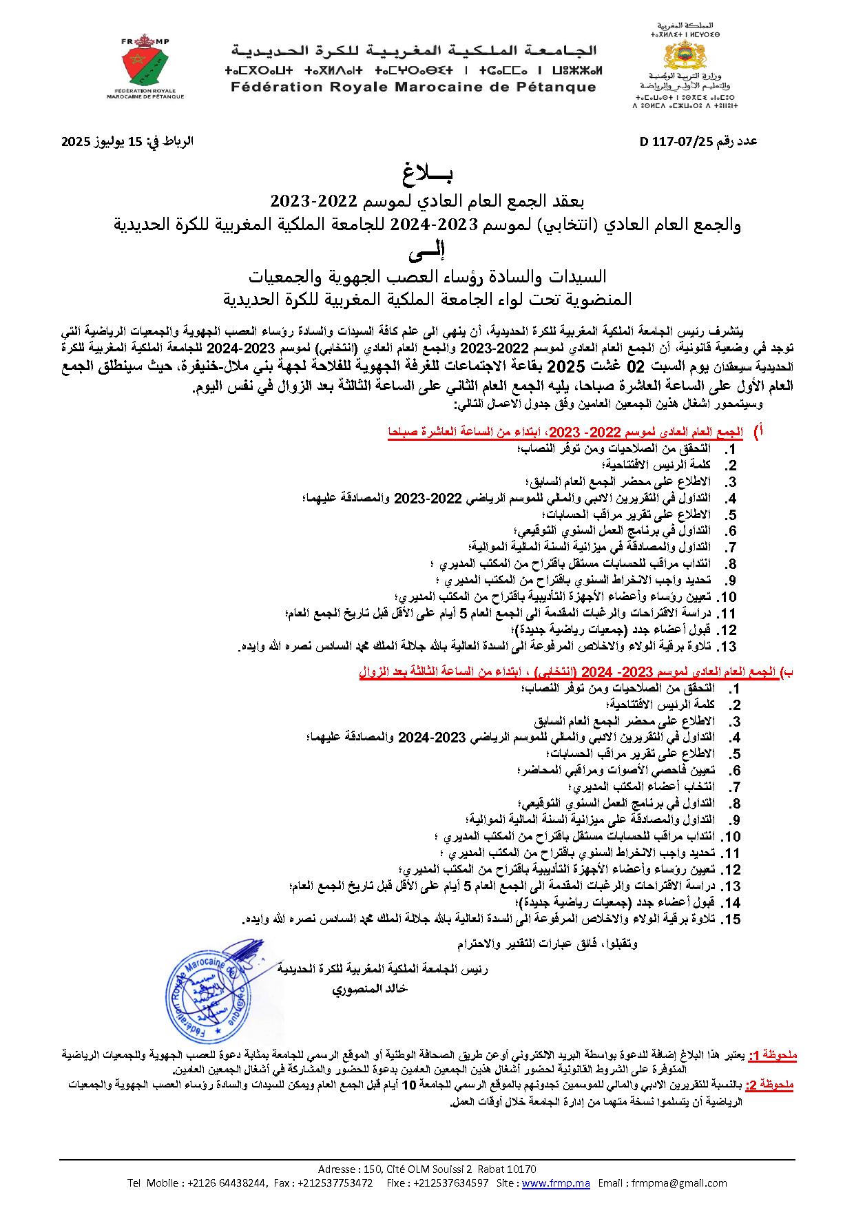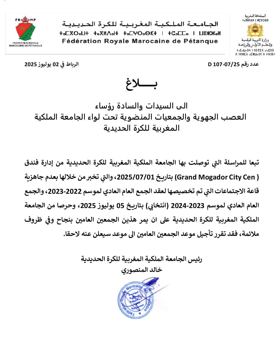 تأجيل الجمعيين العامين للجامعة الملكية المغربية للكرة الحديدية ليوم 05 يوليوز 2025 إلى أجل لاحق