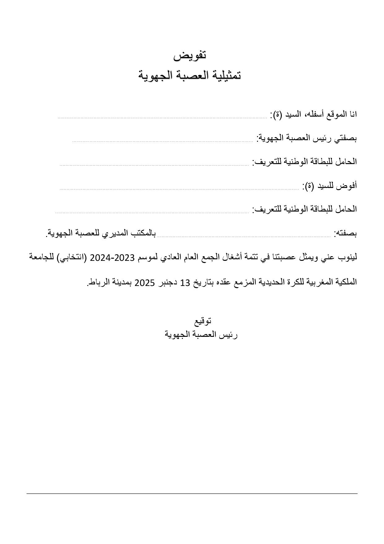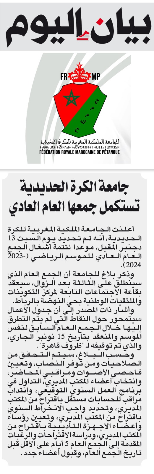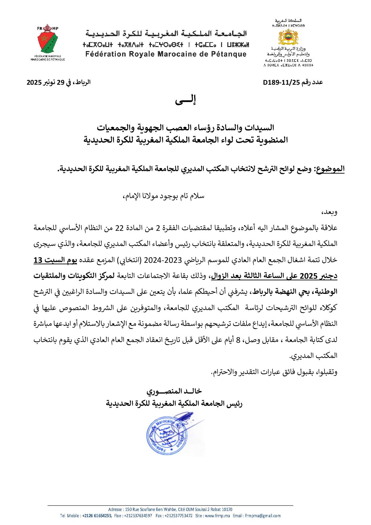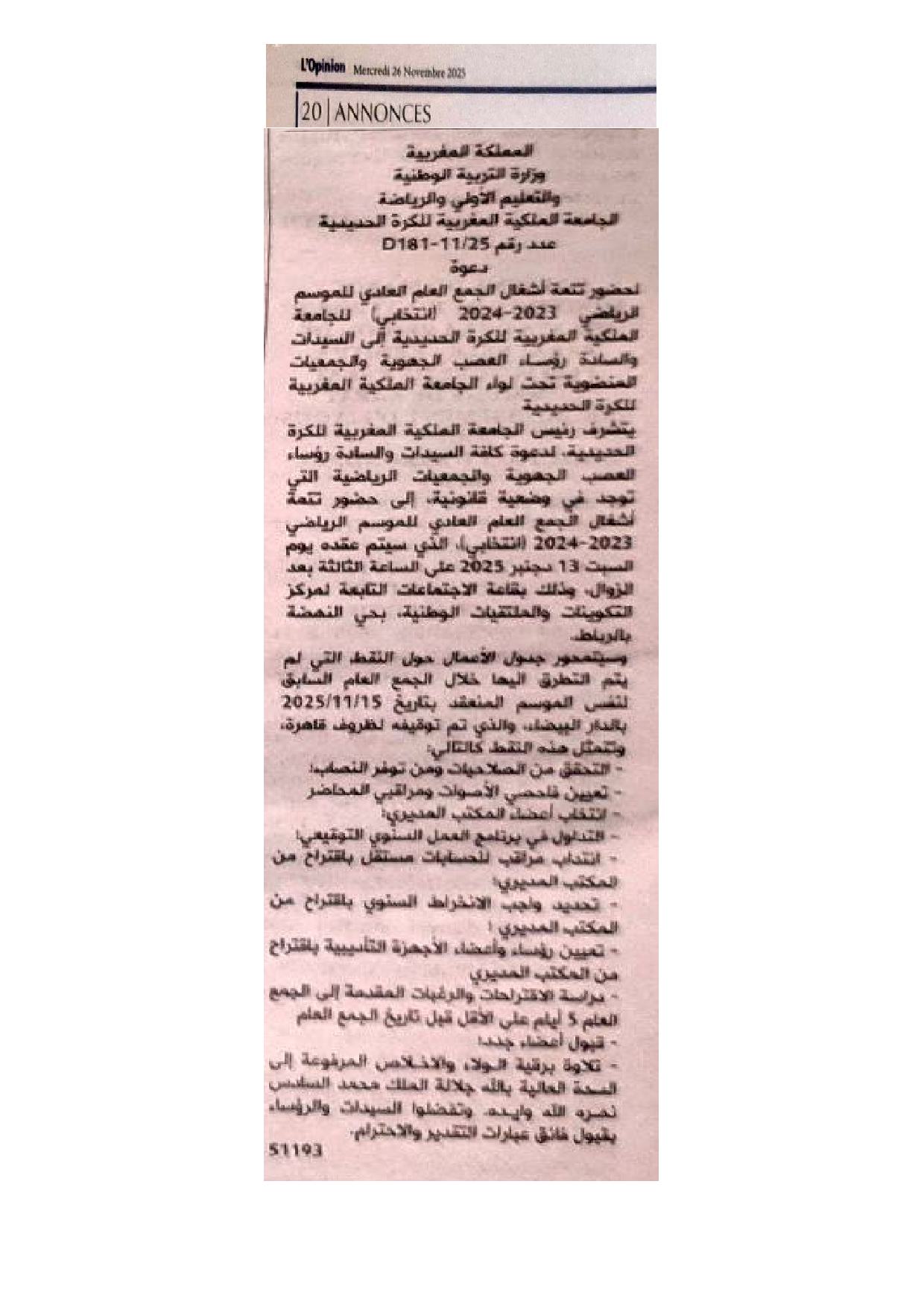 دعوة الجمعيات والعصب الرياضية لاستكمال الجمع العام العادي (انتخابي) موسم 2024/2023 للجامعة الملكية المغربية للكرة الحديدية يوم 13/12/2025 بالرباط