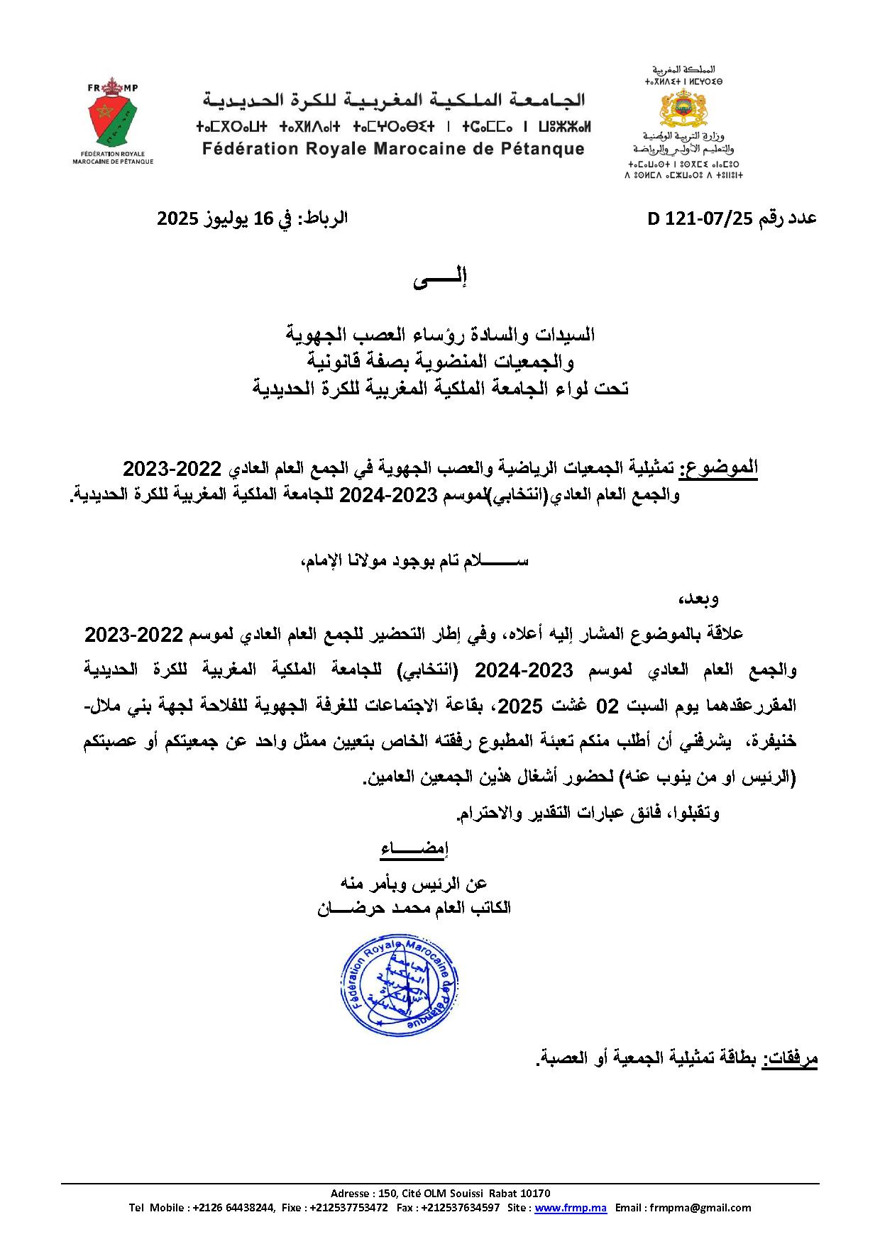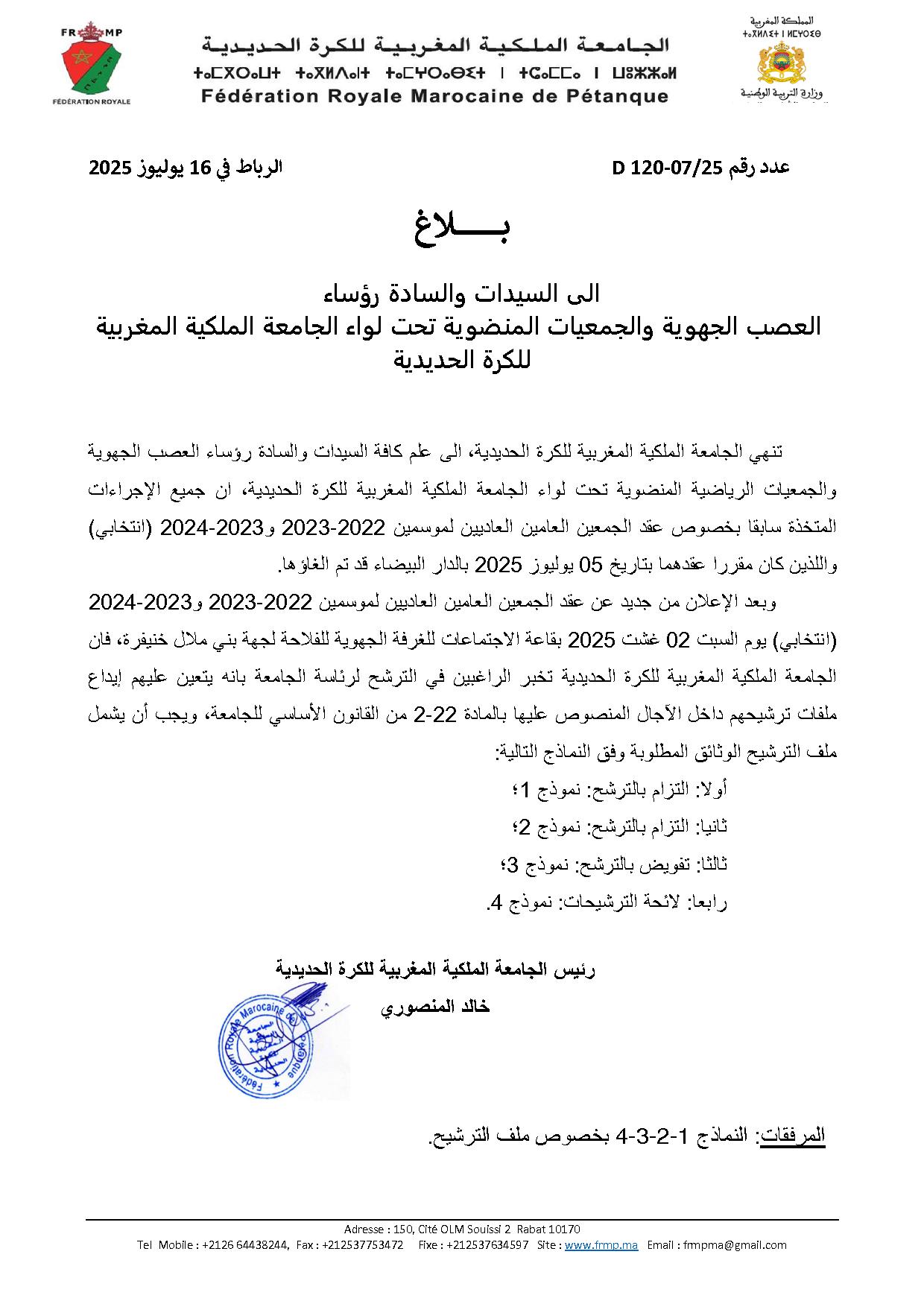 تأجيل الجمعيين العامين للجامعة الملكية المغربية للكرة الحديدية ليوم 05 يوليوز 2025 إلى أجل لاحق